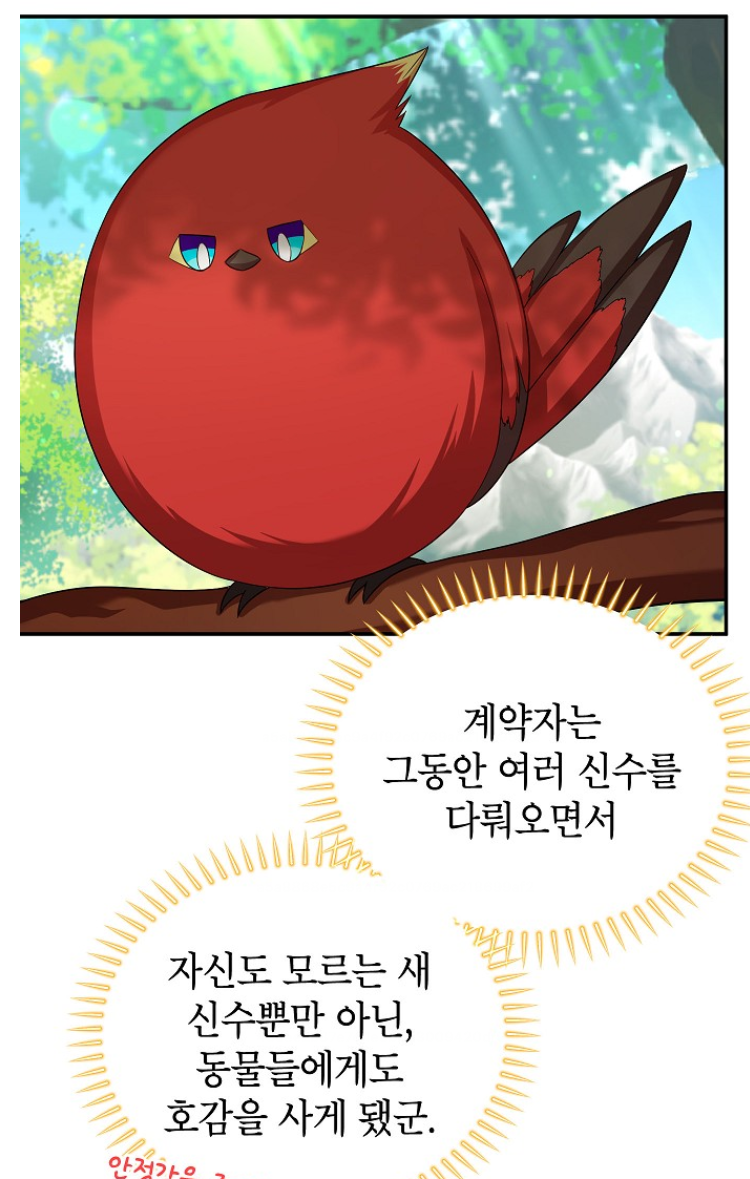 특히 신수의 왕은 정말 인상적이었어요! 원래는 거대한 모습이지만 작은 형태로 변하면 붉은색 뱁새 모습이 되는데, 그 갭이 너무 귀여워요. 이보나가 회귀 후 고대의 힘을 흡수해 신수의 왕을 소환하는 장면은 정말 압권이었죠.